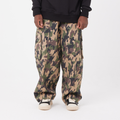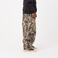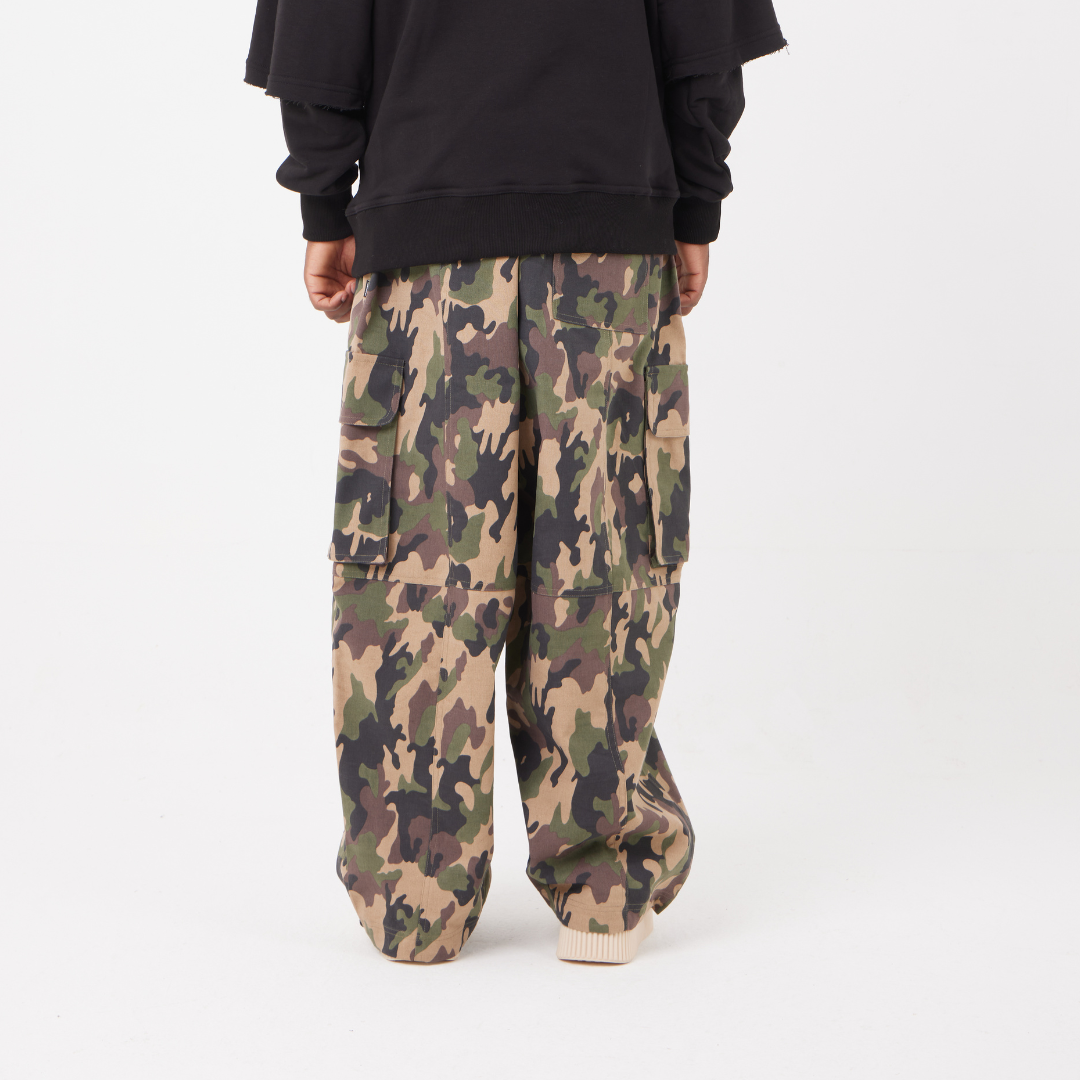 Pantalone cargo a gamba extra-wide in stampa woodland, progettato per dare volume al look senza rinunciare alla funzionalità. Le pannellature con impunture a vista disegnano il movimento del tessuto, mentre l’orlo con regolatore a cordino ti permette di passare da fit dritto a caviglia raccolta in un attimo.