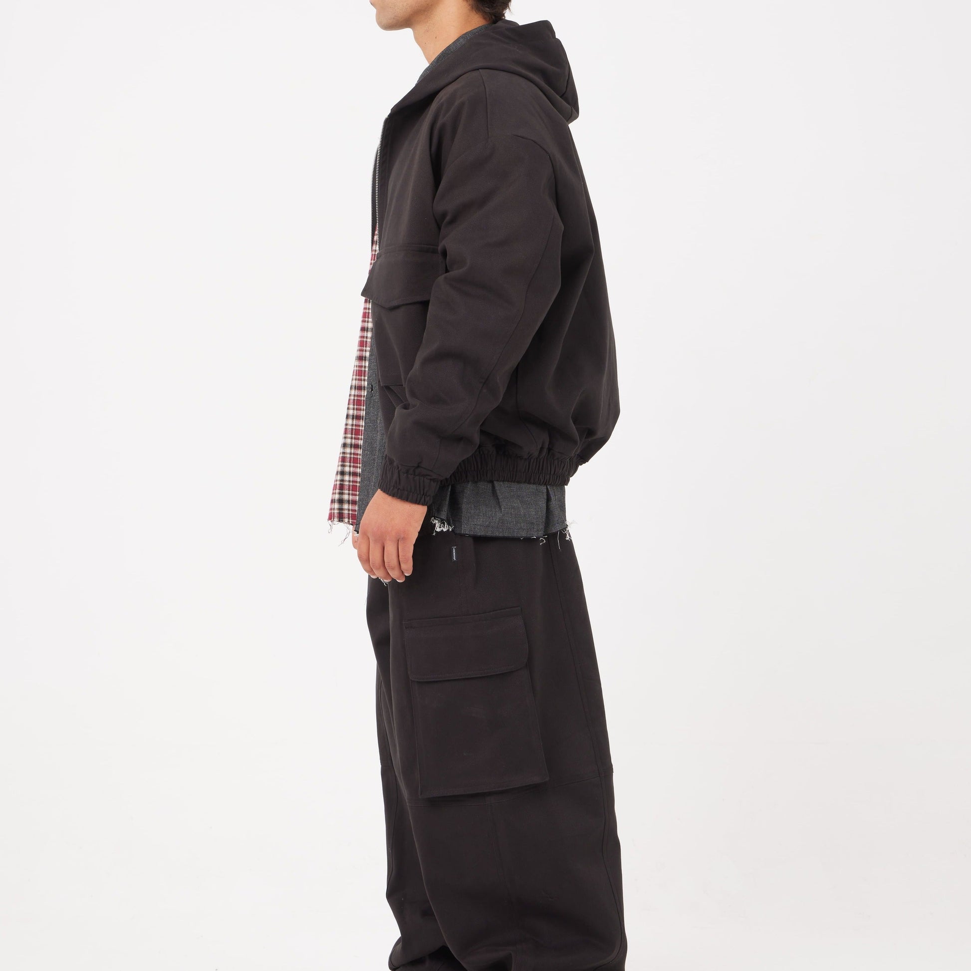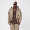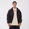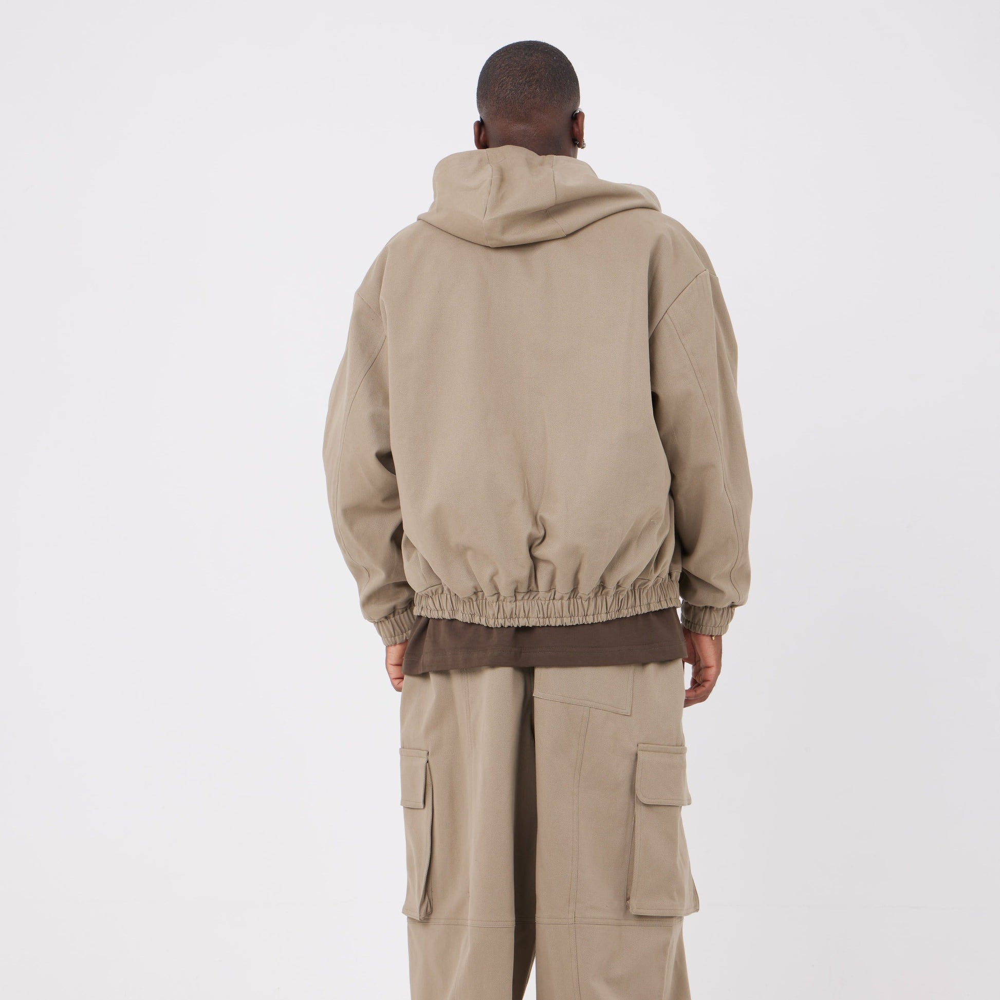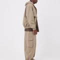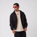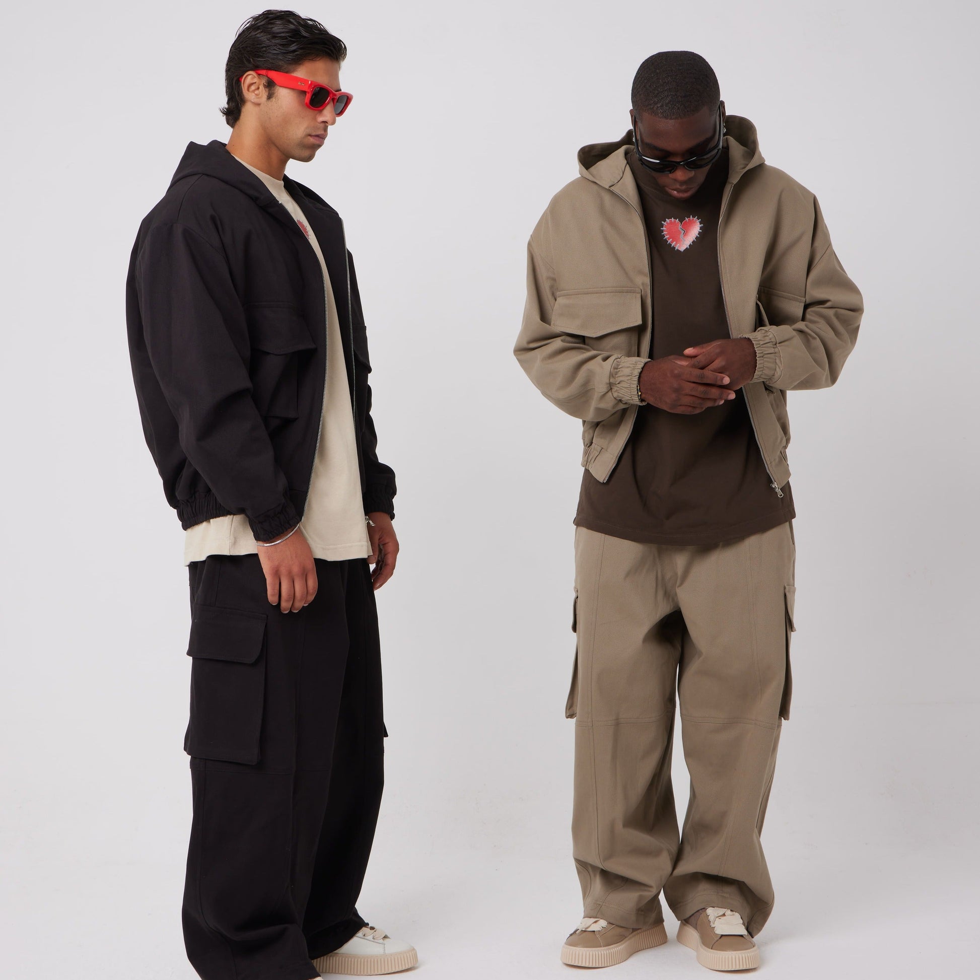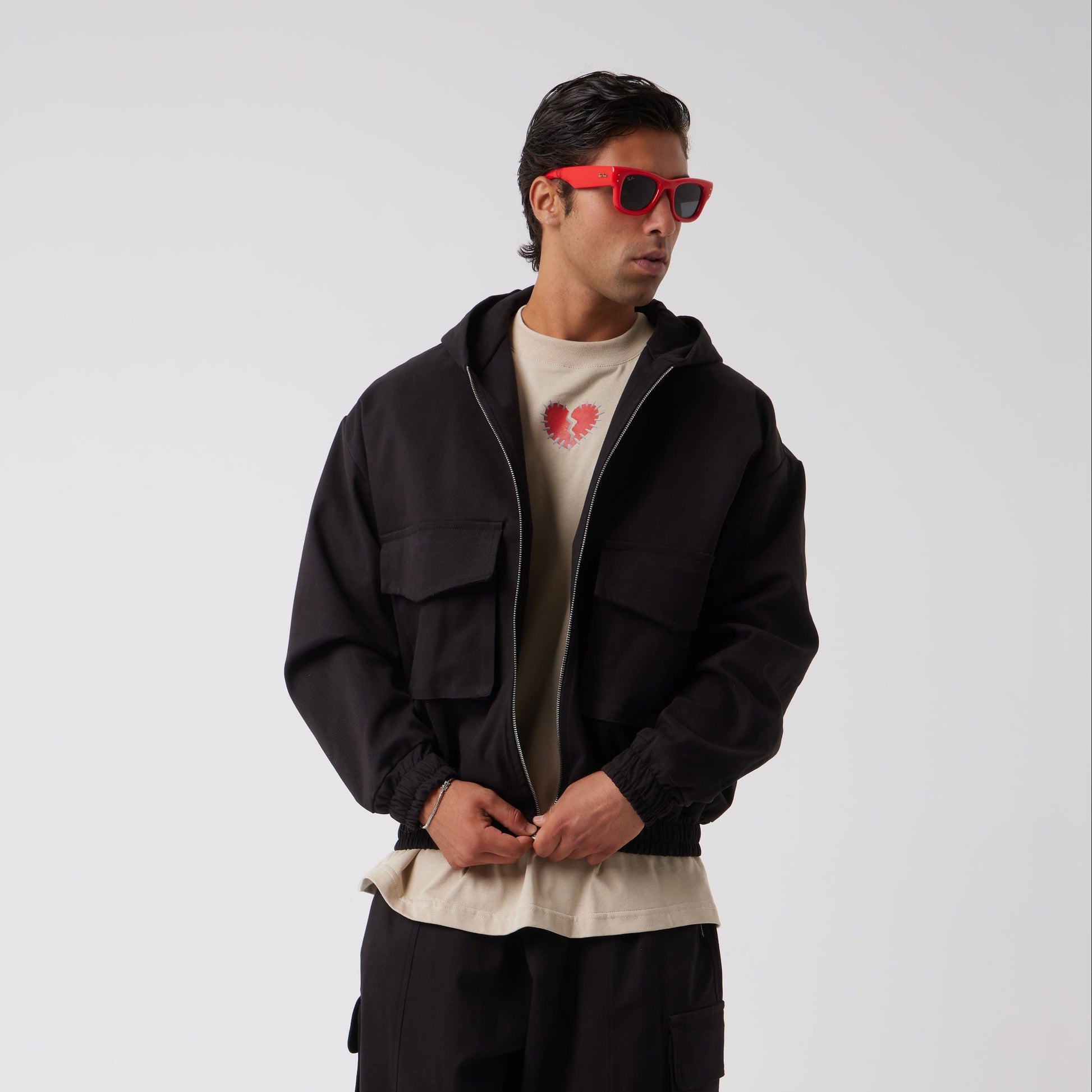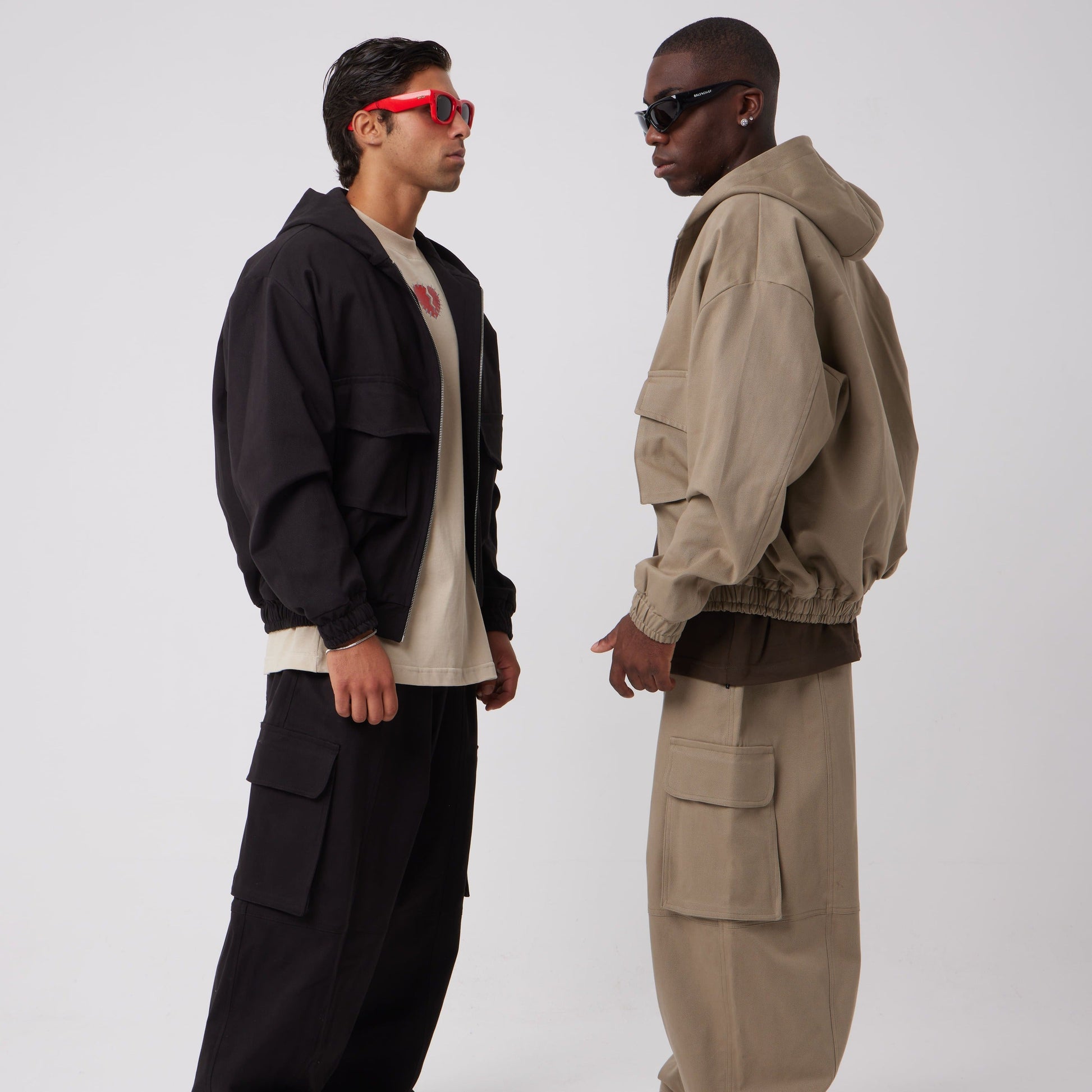 Utility Jacket: zip frontale, cappuccio, quattro tasche cargo con pattina, fondo e polsini elasticati per una linea boxy e controllata.