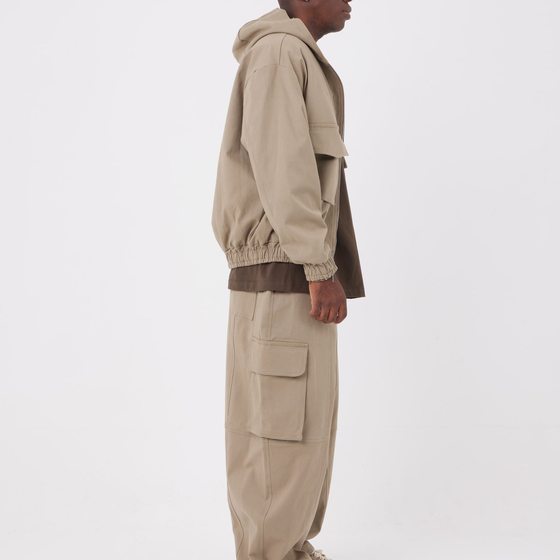 SEO: coordinato utility uomo, set giacca e cargo, tuta workwear premium, coordinato oversize sabbia/nero, Asensyo.