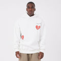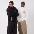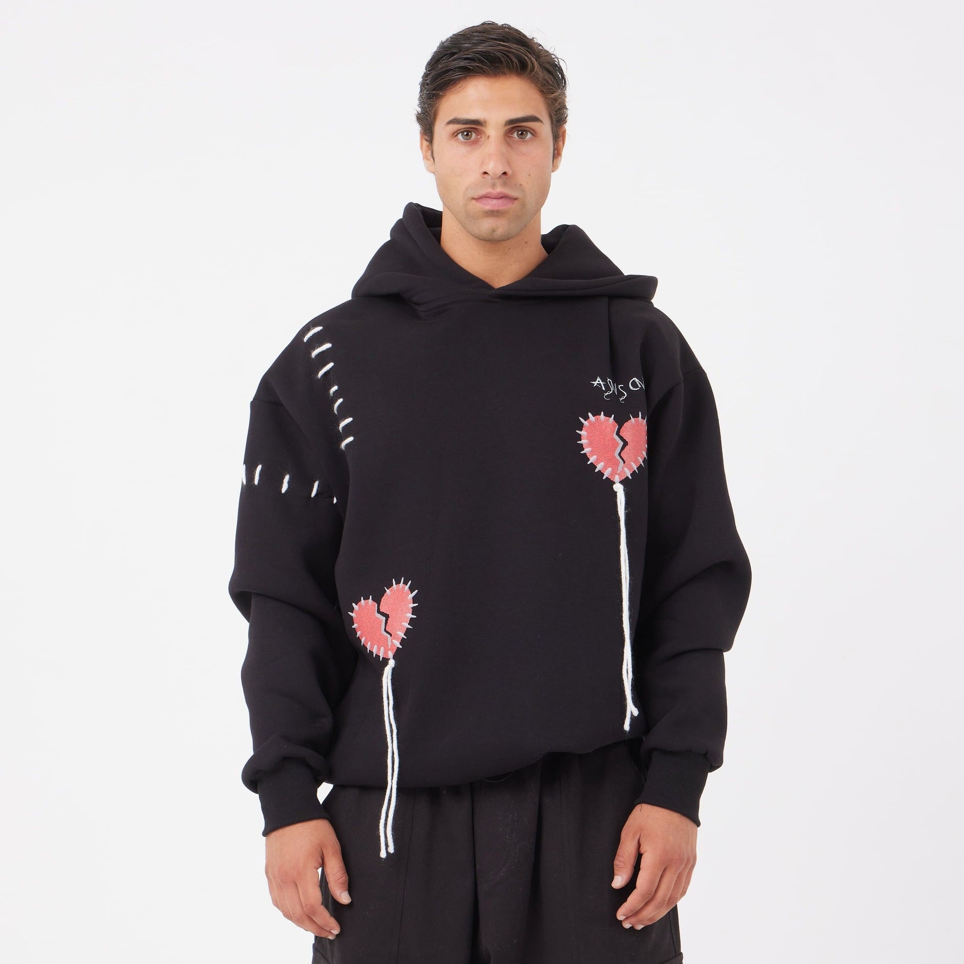 Una felpa nera con cappuccio che parla senza alzare la voce. Il volume è rilassato, le spalle scese disegnano una linea contemporanea e i dettagli grafici — cuori rosso corallo “sbriciolati” e impunture bianche a contrasto — firmando uno streetwear d’autore che non chiede permesso per farsi notare.