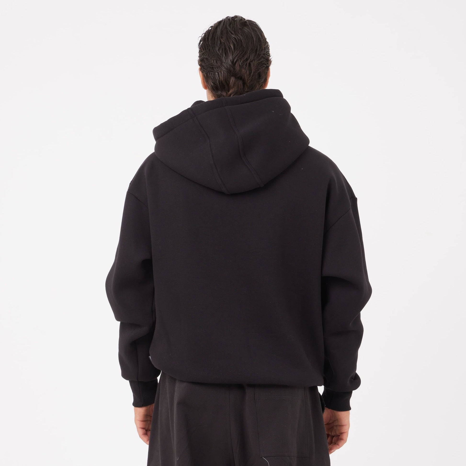 Funziona con cargo, denim scuro o pantaloni ampi: il nero profondo amplifica i contrasti, i dettagli fanno il resto. Basta la felpa per costruire il look.