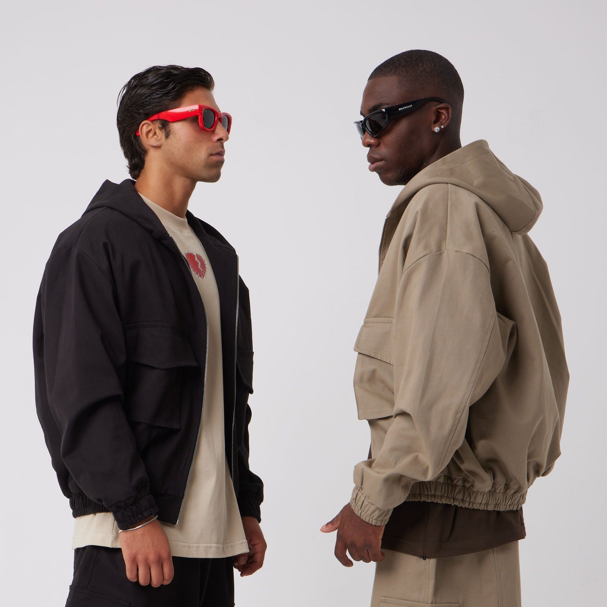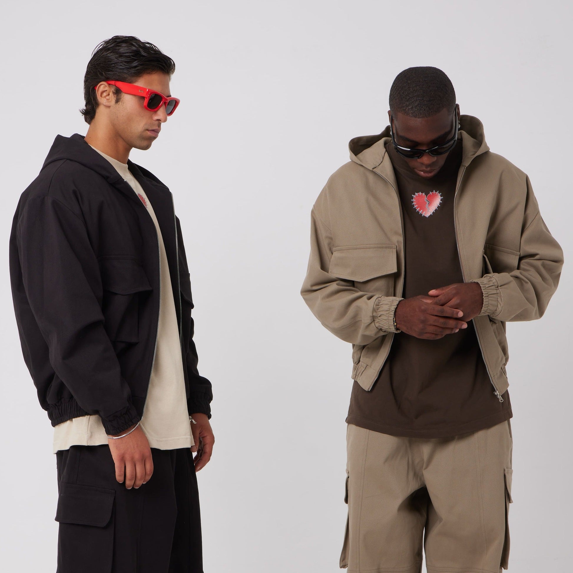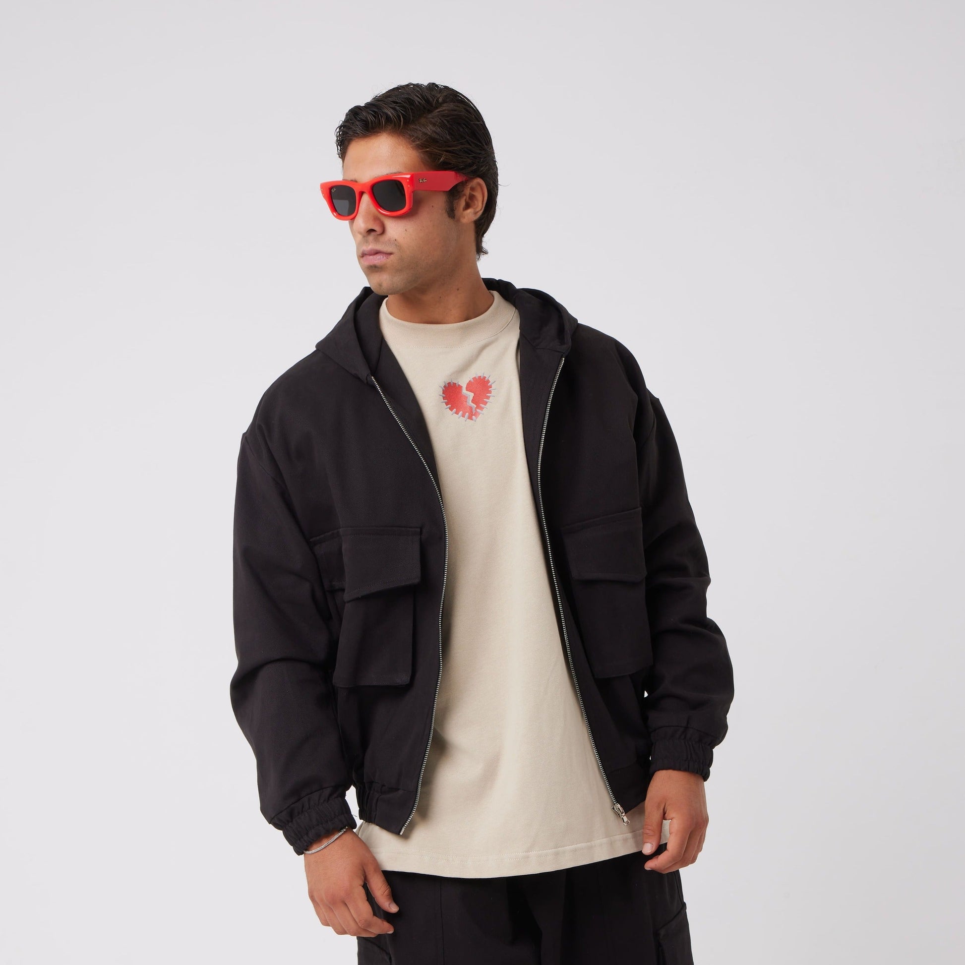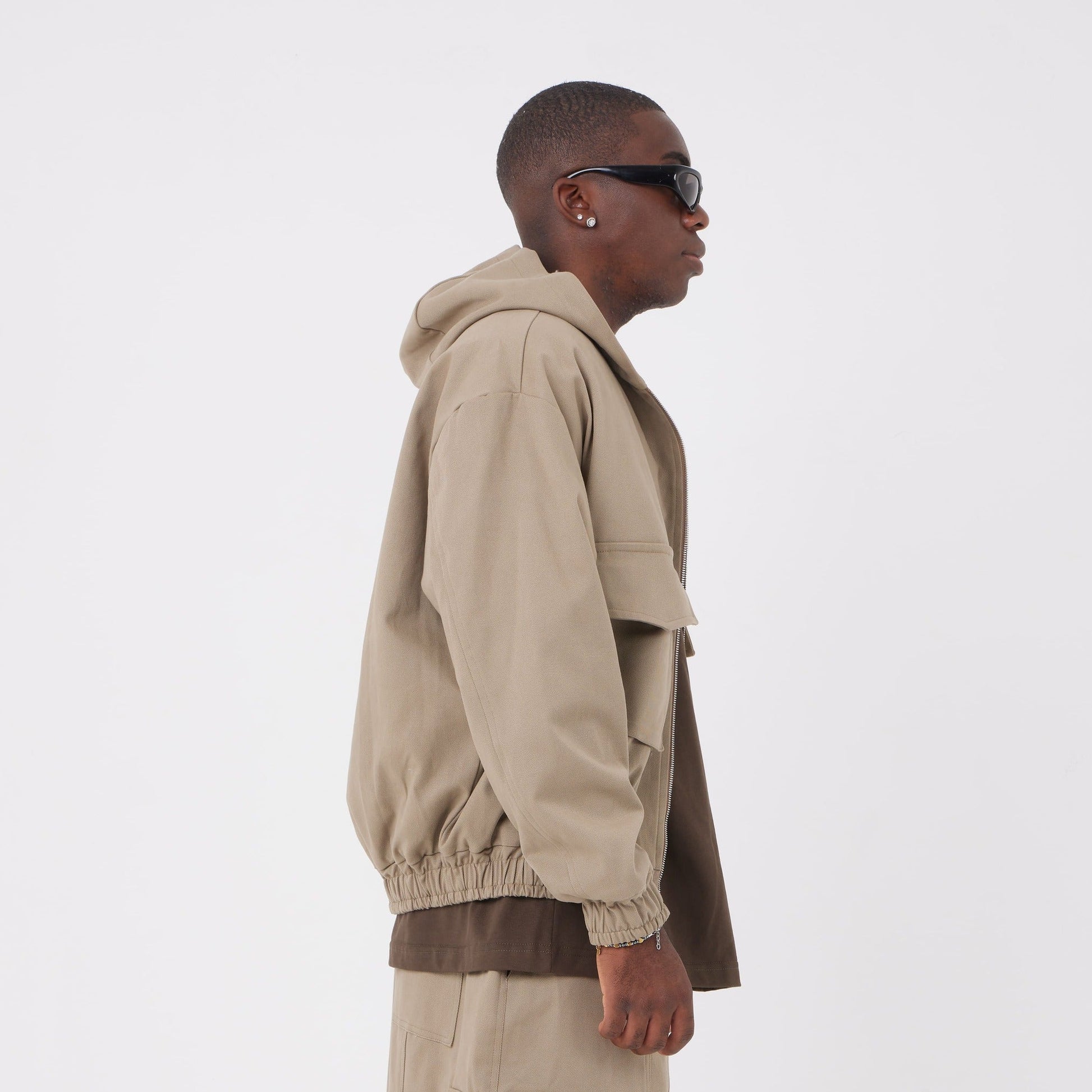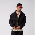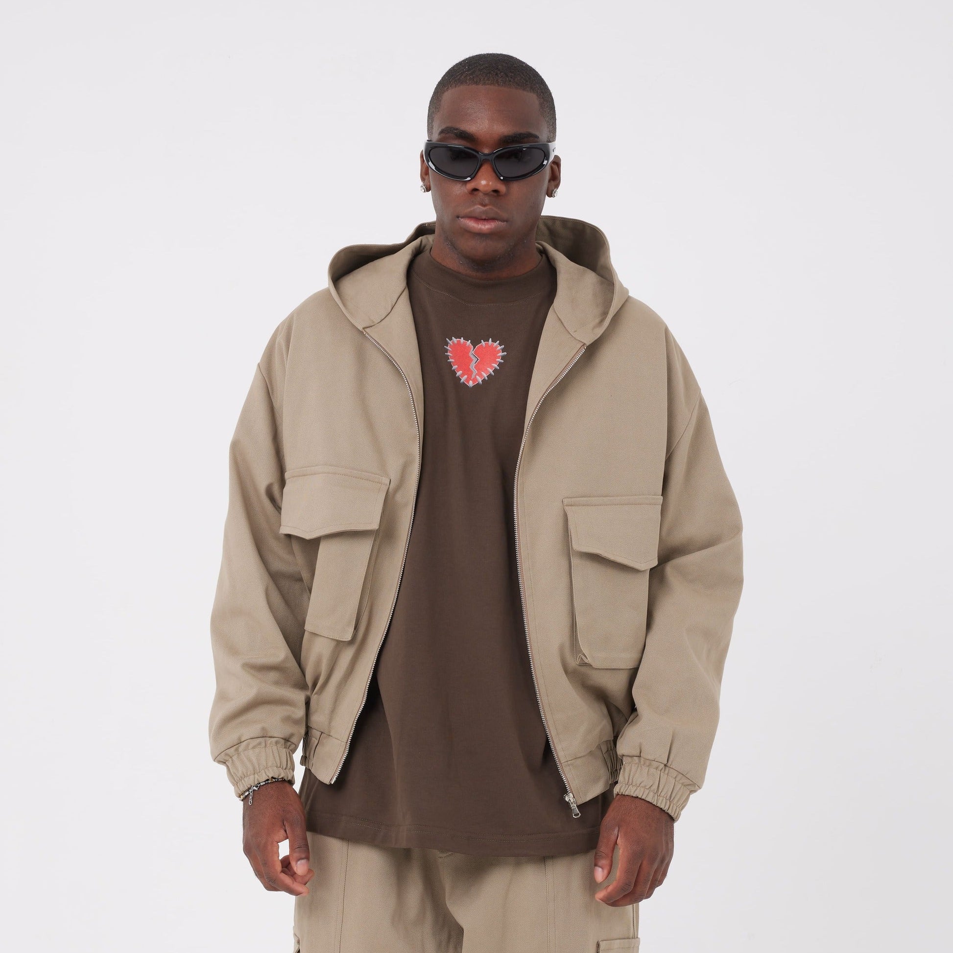 Keyword SEO: giacca utility uomo, giacca con cappuccio zip, giacca cargo tasche frontali, streetwear oversize, Asensyo.
