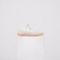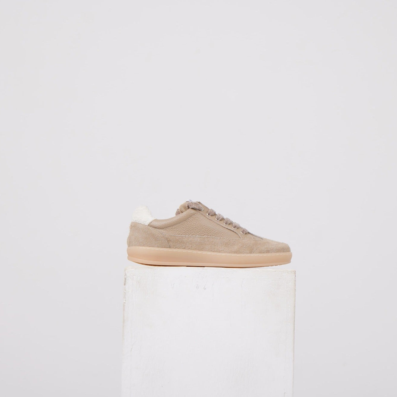 Sneaker Essential: tomaia in mix di pelle liscia e suede, fodera interna morbida, lacci in cotone e suola in gomma naturale. Struttura compatta, silhouette minima, proporzioni calibrate per un'estetica contemporanea.