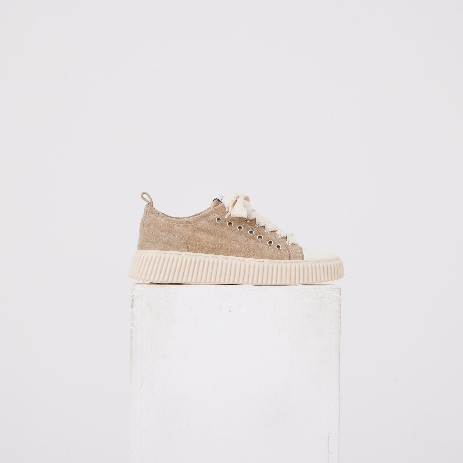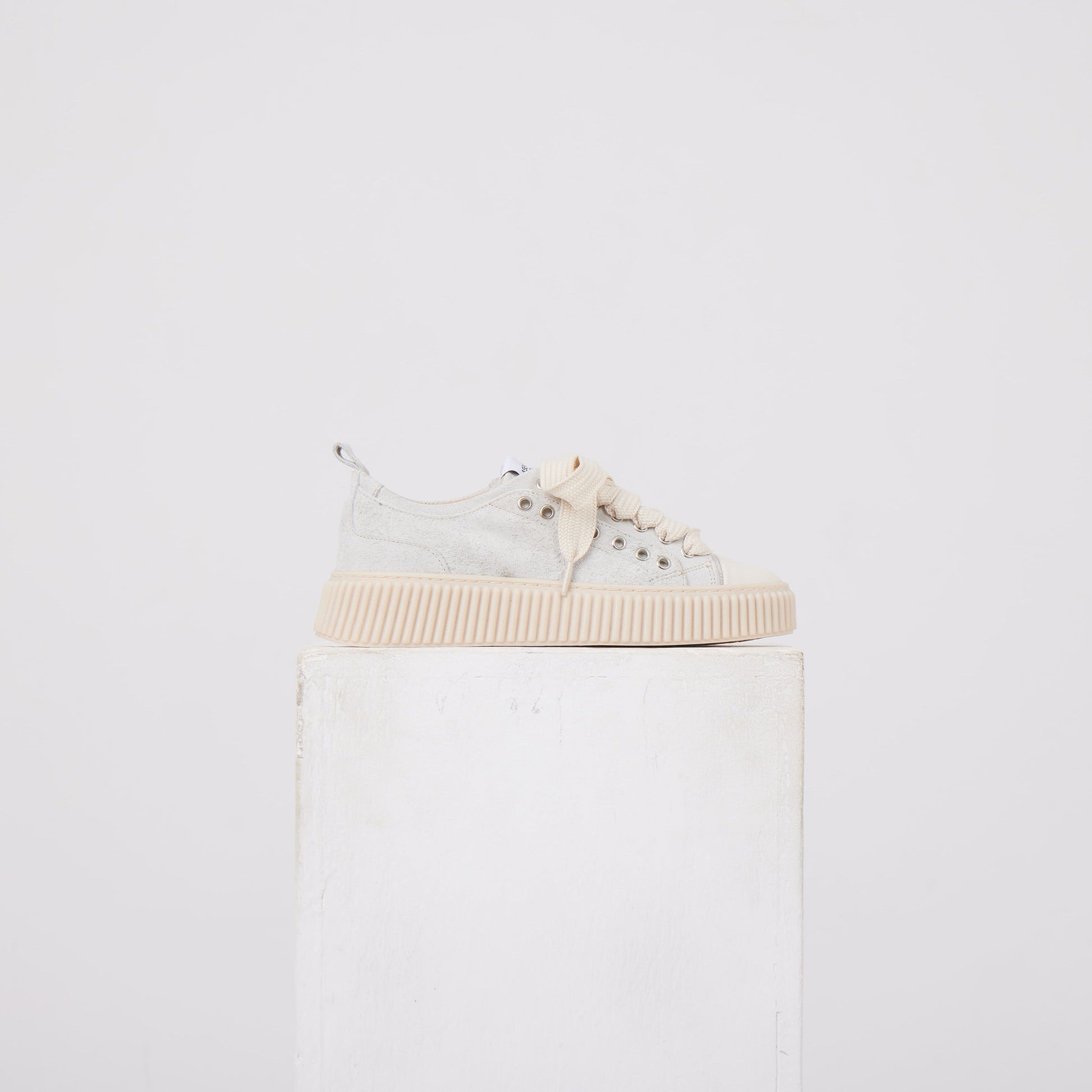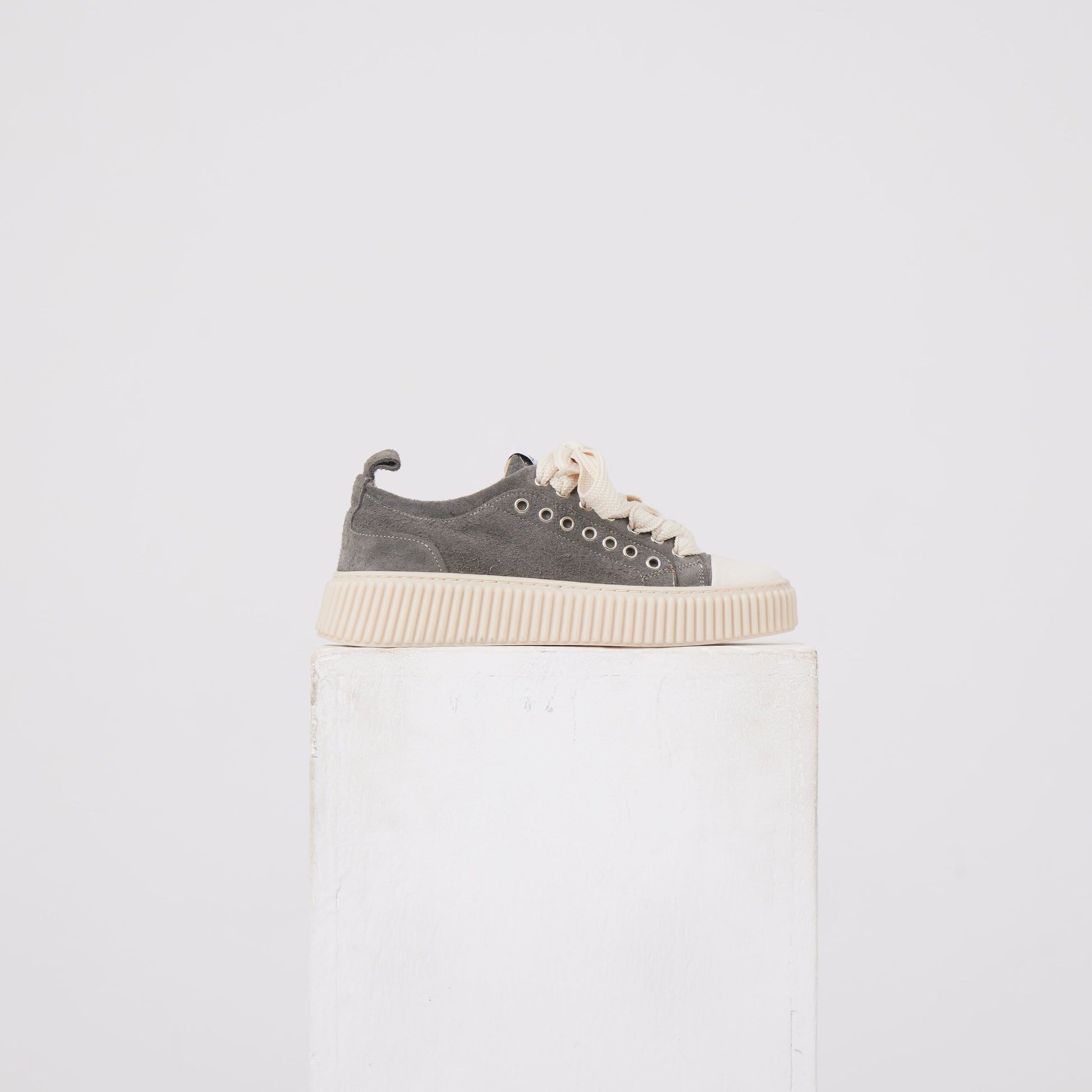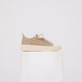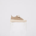Sneaker Platform: tomaia in tessuto effetto suede con rinforzi tono su tono, lacci in cotone largo e suola in gomma a profilo alto. Dettagli metallici discreti e costruzione compatta per una calzata stabile e moderna.