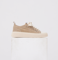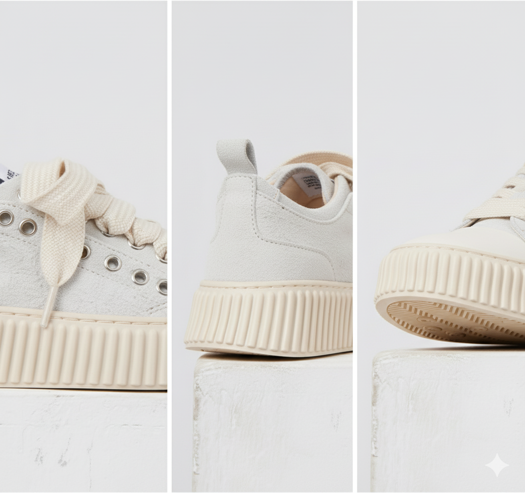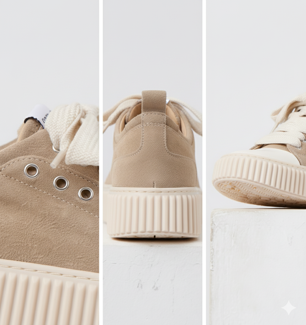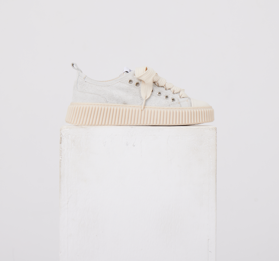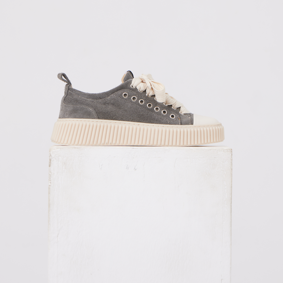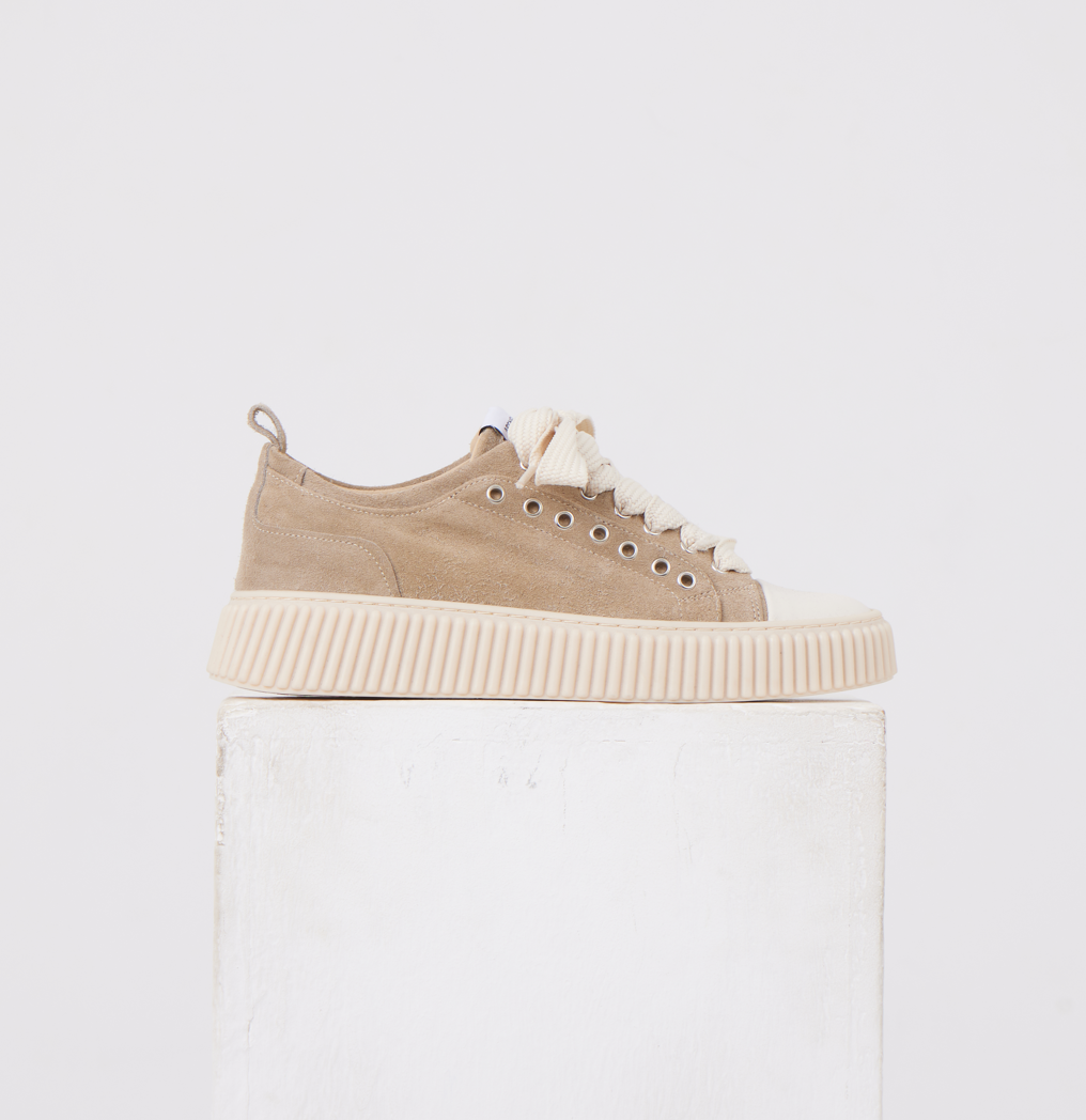 Low-top essenziale con carattere scultoreo: tomaia in suede e suola a coste crema che firma il look senza urlare.