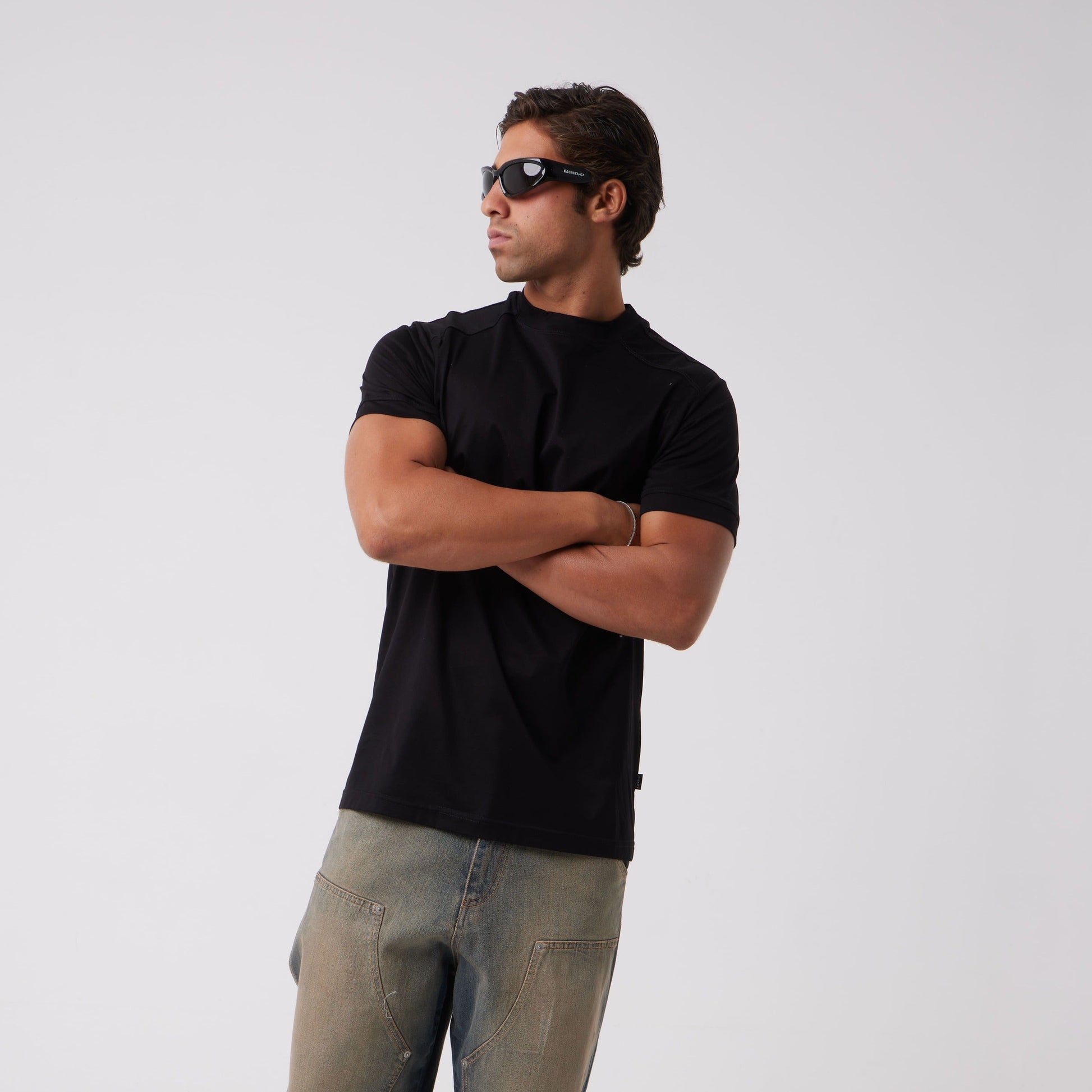 SEO: t-shirt mock neck uomo, maglietta collo alto corto, t-shirt nera/bianca premium, t-shirt minimal streetwear, T-shirt Asensyo.